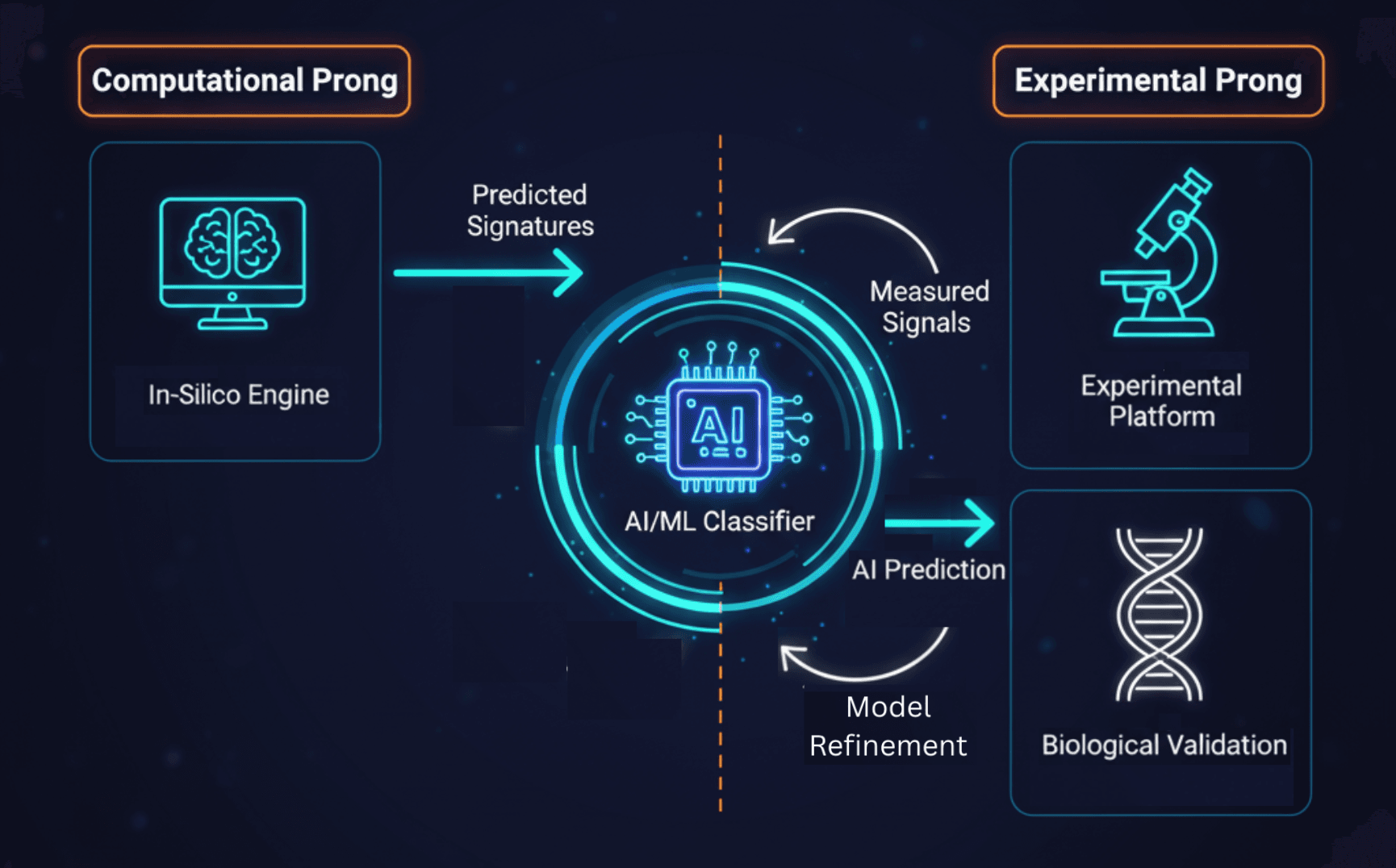 Our competitive advantage lies in our unique, dual-pronged architecture that bridges physics-first simulation with real-world biological validation. The Computational Prong acts as a data factory, generating a massive library of predicted molecular signatures. The Experimental Prong uses our quantum sensors to measure the real-world signals from live cells. By using the experimental data to continuously validate and refine our computational models, we create a powerful feedback loop that makes our platform more precise with every sample we analyze.