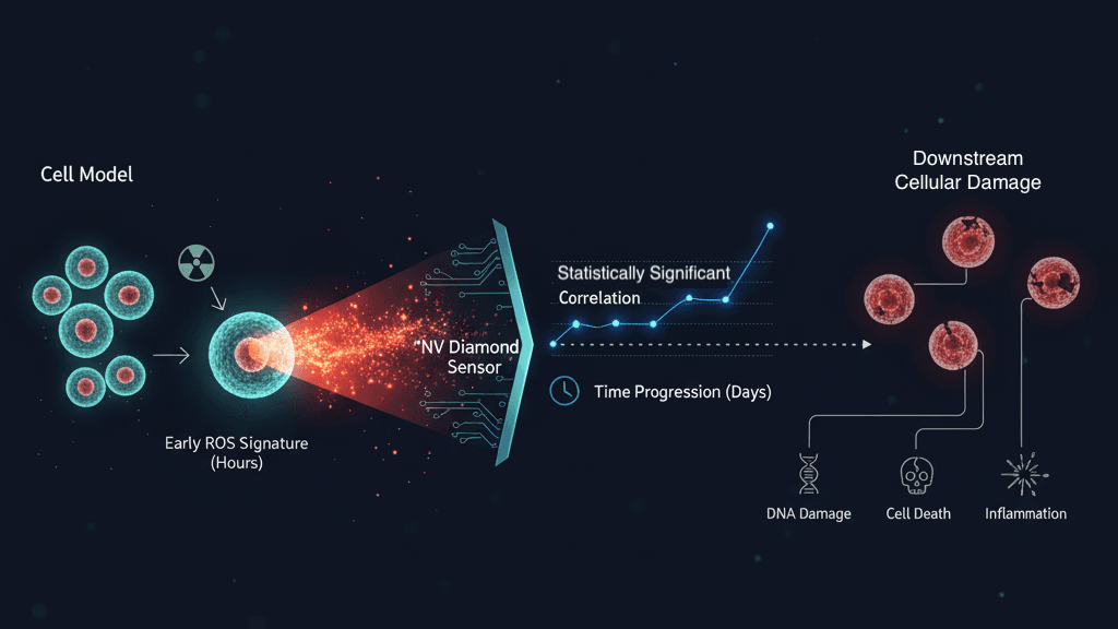 Our experimental platform provides the ground truth data needed to validate our simulations. We use custom-engineered NV-diamond quantum sensors to measure the real-world ROS burst from live, irradiated human cell cultures. By correlating the acute T1 relaxometry signal we measure within hours to a comprehensive panel of downstream biomarkers of cell death and damage, we can definitively prove the predictive power of our platform.